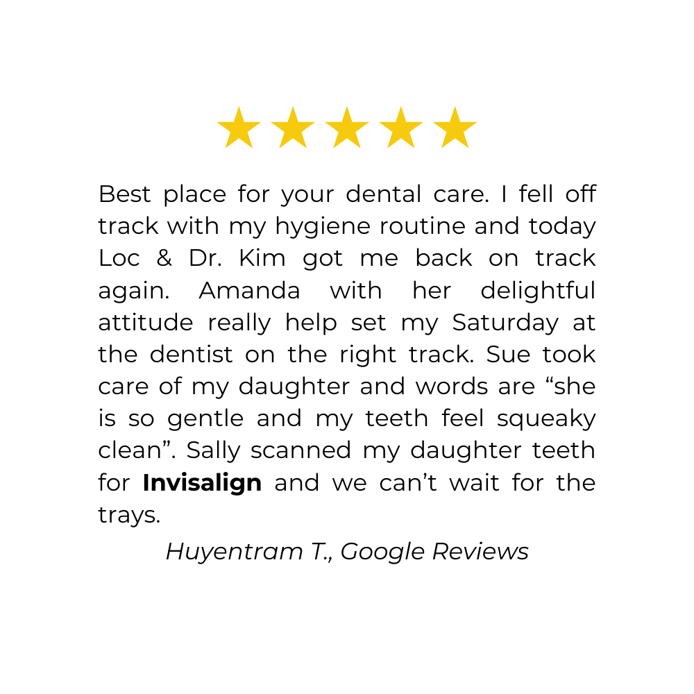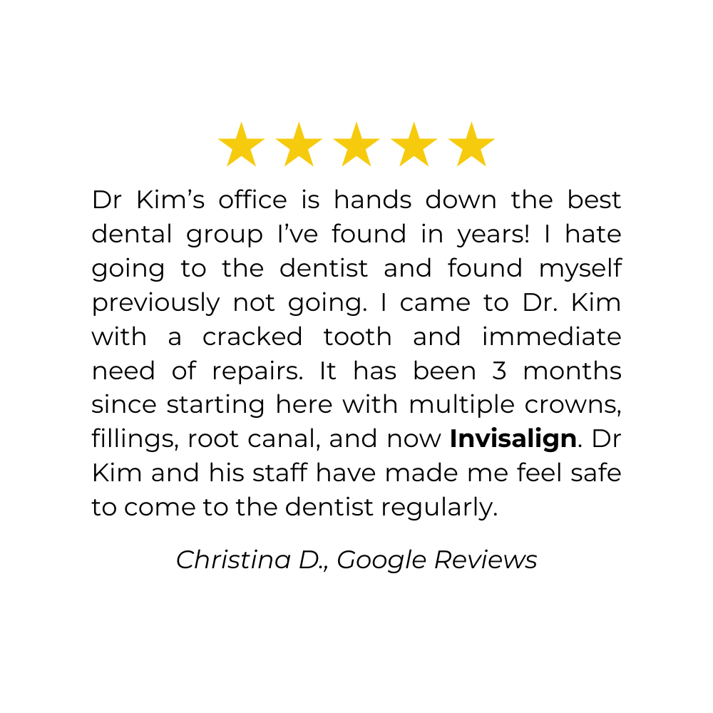 Experience the convenience of Invisalign clear aligners if you desire a straighter smile without the inconvenience of metal braces. These virtually invisible aligners are easily removable, granting you the freedom to eat and drink as you please. As your treatment with Dr. Kim and the team progresses, you'll receive new aligners every few weeks, resulting in the beautiful smile you've always wanted.
